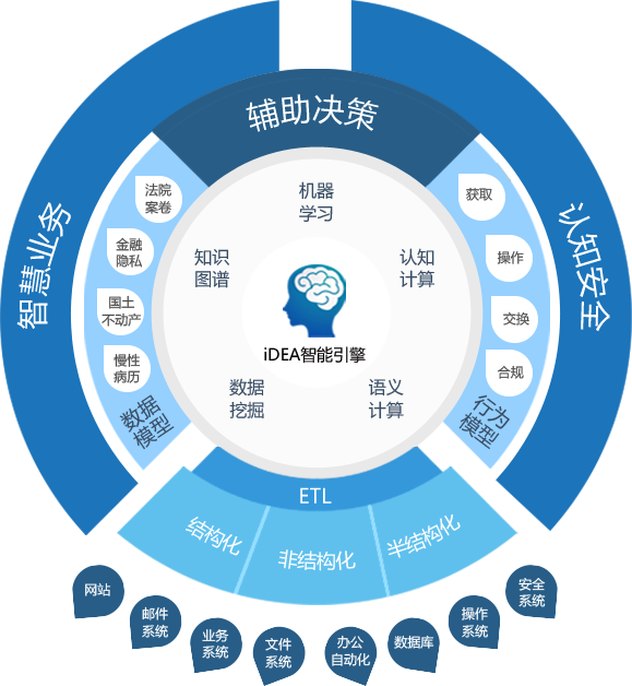 依托智能引擎核心技术,通过数据获取、清洗、语义计算、数据挖掘、机器学习、知识图谱、认知计算,形成数据模型、行为模型,进而提升客户业务价值和安全防护能力。